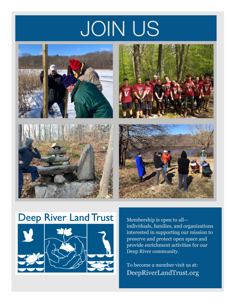 Since 1975 the generous support of our members and donors has sustained the Deep River Land Trust (DRLT). The DRLT has been preserving and protecting our rare freshwater tidal marsh, woodlands, important watershed for the lower Connecticut River, and beautiful green spaces that provide outdoor opportunities for hikers, birders, and nature enthusiasts for current and future generations.